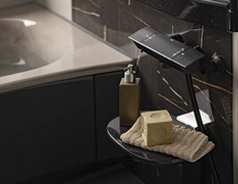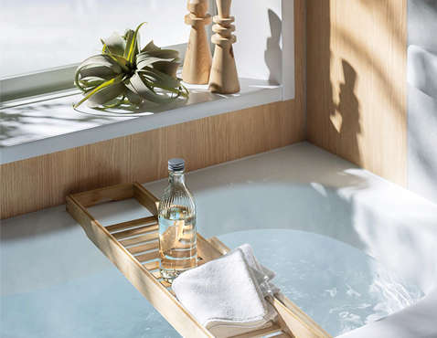 一日の疲れを落とす浴室で、くつろぎの舞台となるのはバスタブ。直接肌に触れる部分だからこそ、肌ざわりのなめらかさを大切にしています。バスタブ専用に開発をおこなっている独自の素材です。